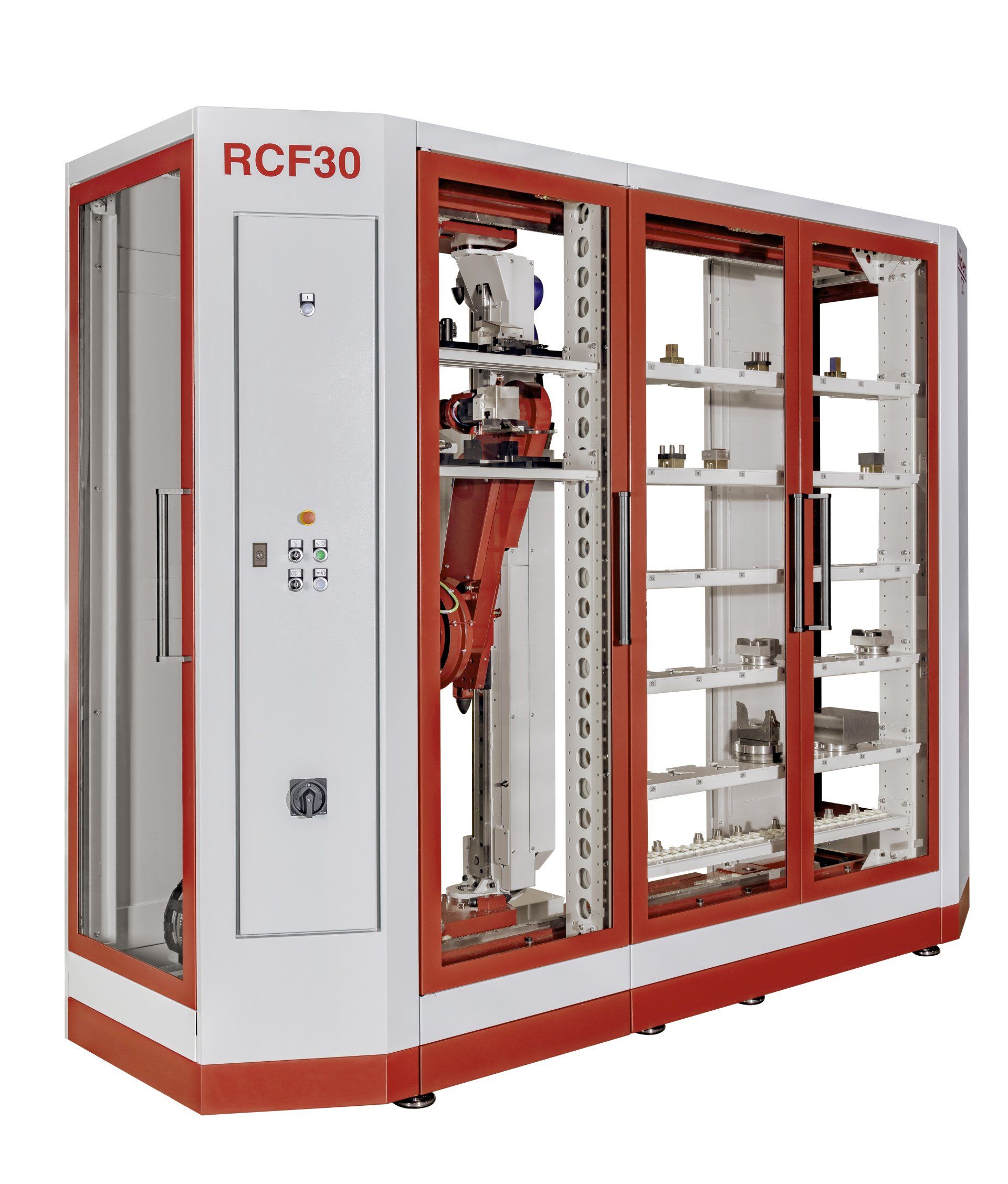 Der RCF 30 ist ein extrem schmales (Breite < 1 m), lineares Handlingsgerät für die Automation mehrerer Fräs-, Mess- oder Erodiermaschinen. Es können Werkstücke bis 30 kg Gewicht transportiert werden. Ein Greiferwechsel ermöglicht das Handling unterschiedlicher Palettentypen und Werkzeuge. Der RCF30 wird in fertigen Modulen bei den Kunden angeliefert, so dass langwierige, teure Installationsarbeiten vermieden werden. Eine schrittweise Erweiterung ist möglich.